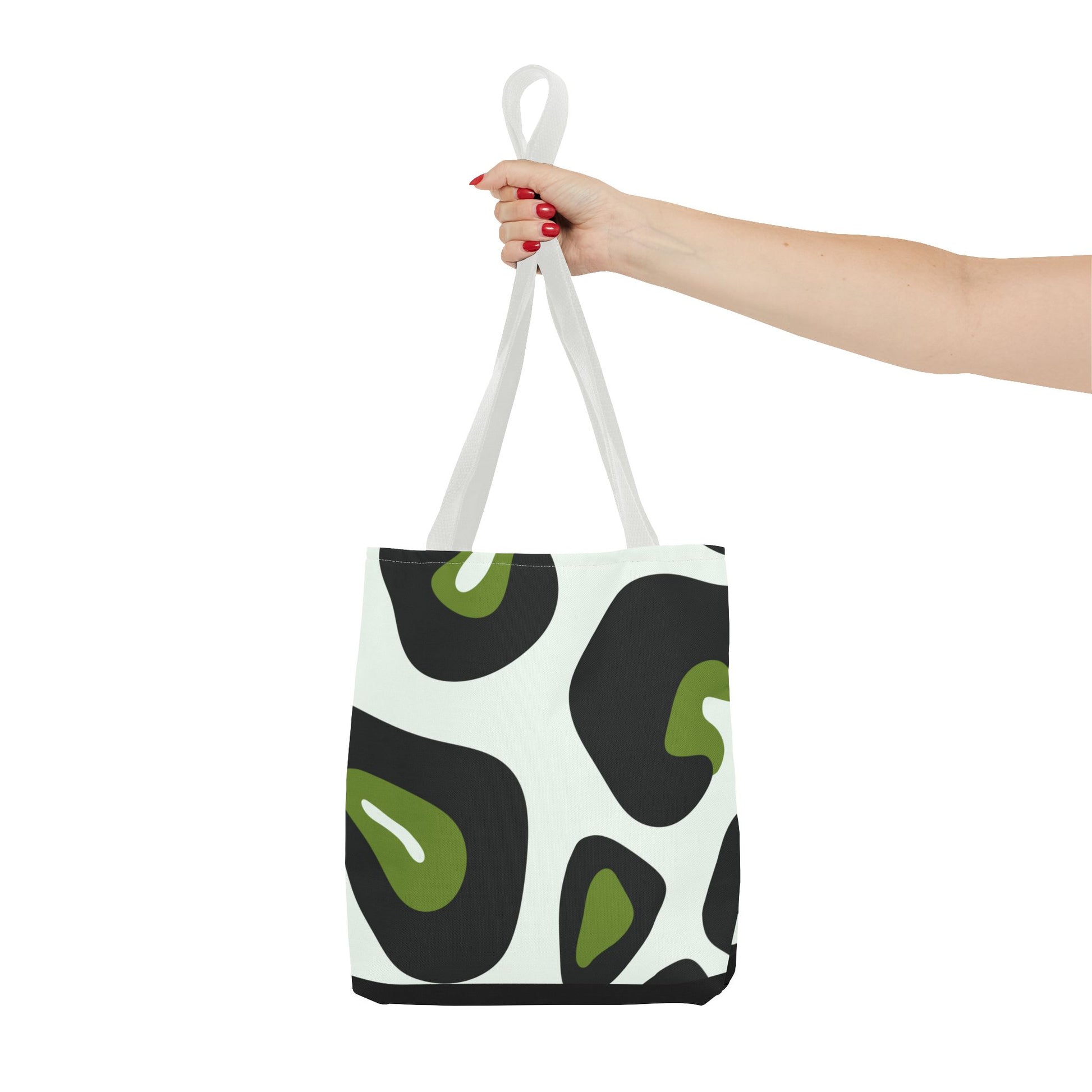 A lightweight, sculptural tote that feels like a tiny art piece you can sling over your shoulder. The all-over print wraps around boxy corners for a continuous, painterly pattern—soft green pods set inside deep charcoal shapes against a pale backdrop. It carries groceries, sketchbooks, or market finds without slumping thanks to a reinforced framed body and medium-weight polyester that keeps its shape and dries fast. The black inner stitching and choice of handle colors give a finished, thoughtfully crafted look that fits city errands, gallery visits, or casual weekend wandering.
