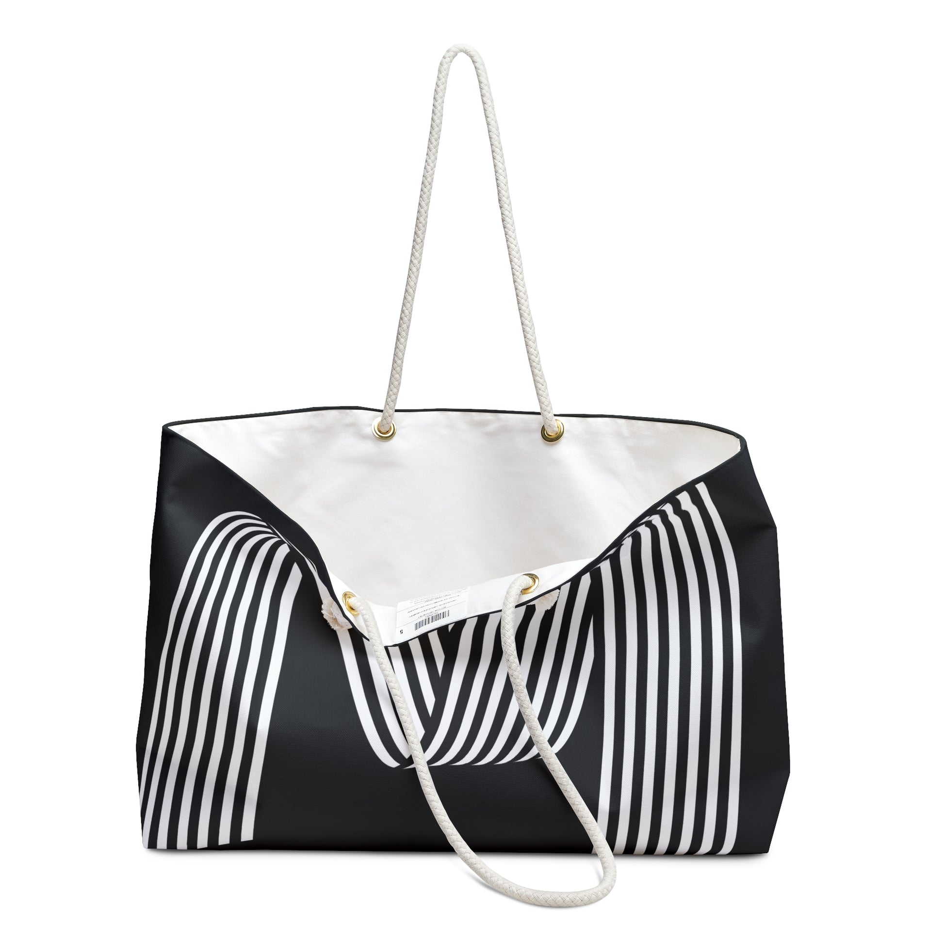 A spacious, carry-anywhere weekender that blends clean modern lines with everyday durability. The roomy 24" x 13" T-bottom silhouette holds clothes, a laptop, and weekend extras without wrinkling thanks to a spun polyester exterior. Soft cream rope handles sit comfortably on the shoulder and thread through gold-color grommets for a nautical-but-refined look. Inside, a cream cotton-poly lining keeps contents protected and adds a subtle contrast to the bold exterior. Whether you're slipping into a train cabin, heading to a coastal cottage, or packing for an overnight studio session, this bag carries more than items — it carries a quietly confident, travel-ready attitude.